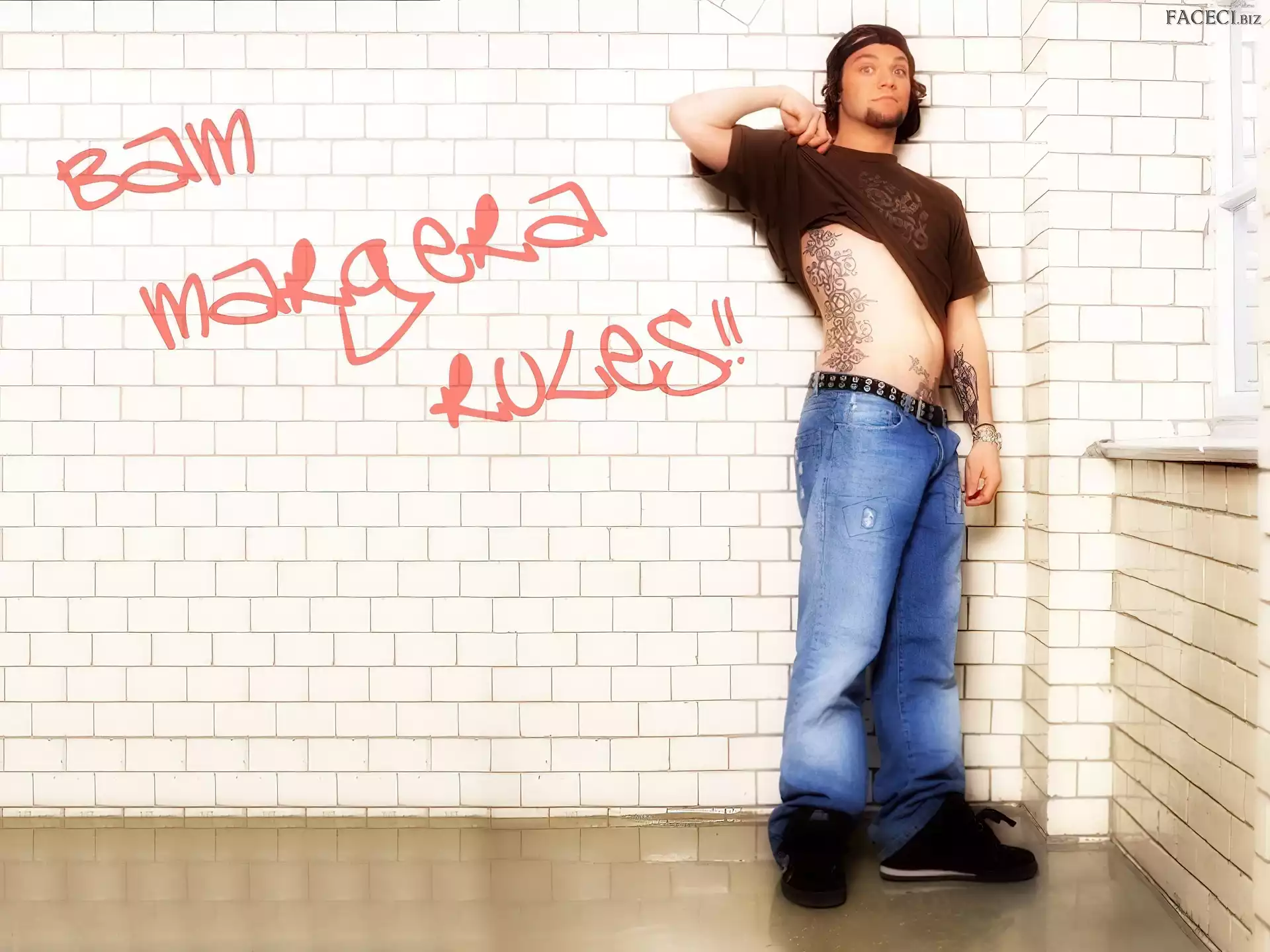 kurtka, Bam Margera, rozpięta okulary, Bam Margera, twarze t-shirt, Bam Margera, brązowy zegarek, Bam Margera, deskorolka okulary, Bam Margera, butelka włosy, Bam Margera, ciemne
